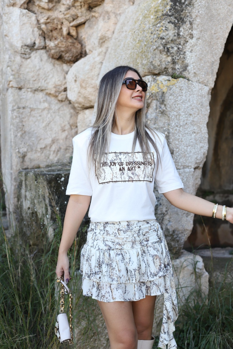 BEJ DESENLİ MİNİ ŞİFON FIRFIR ETEK