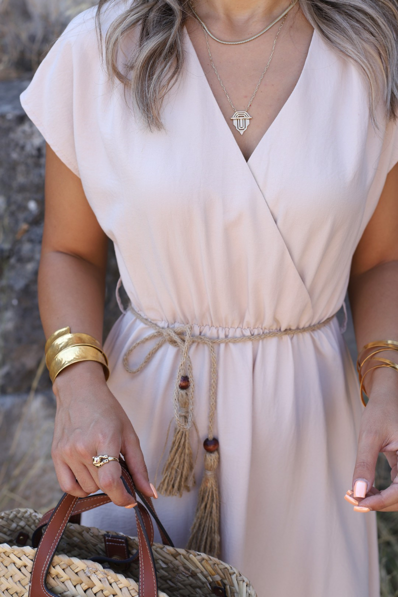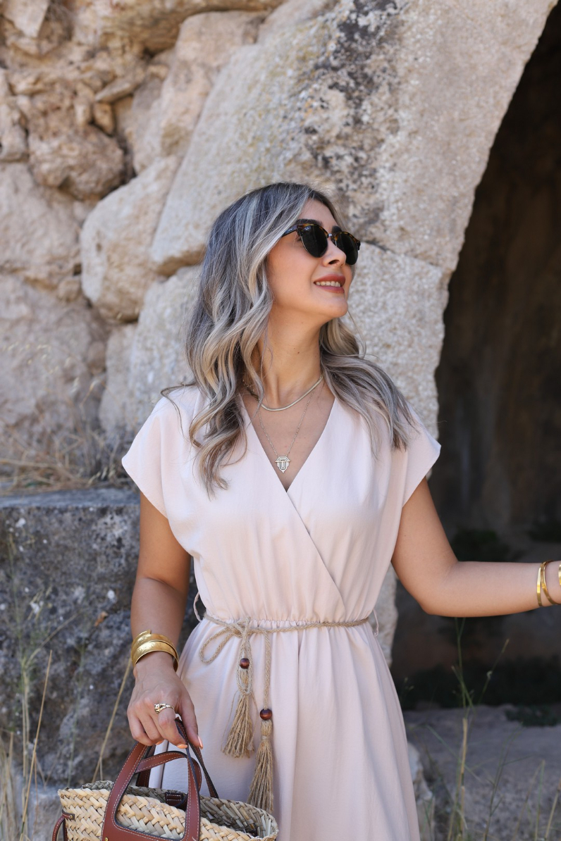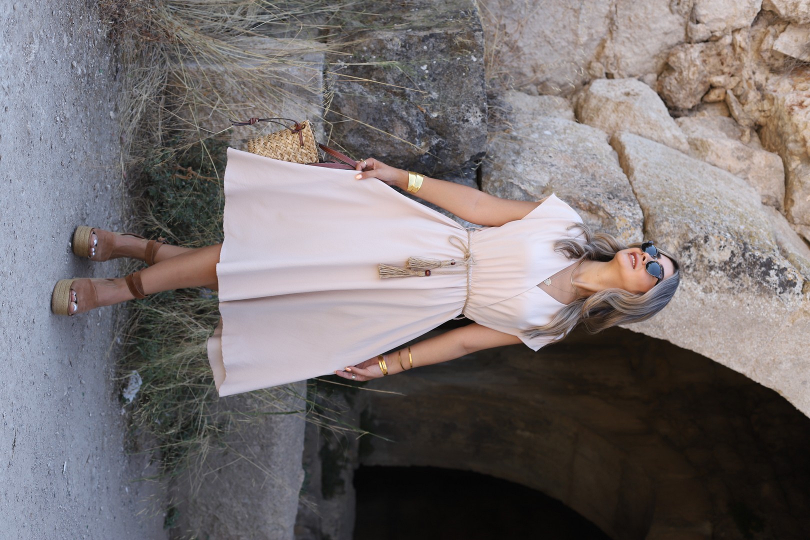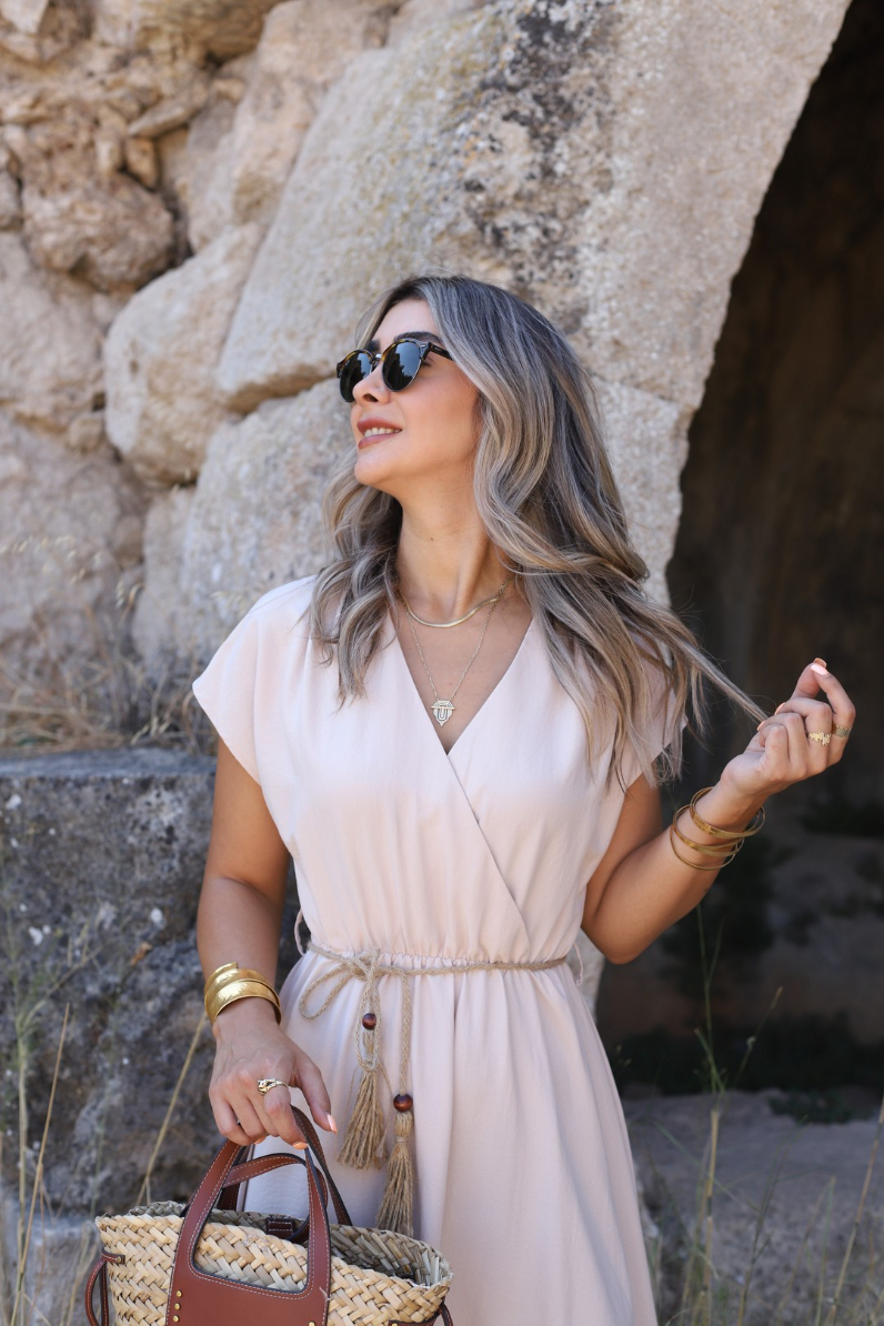 BEJ HASIR İPLİ MİDİ ELBİSE