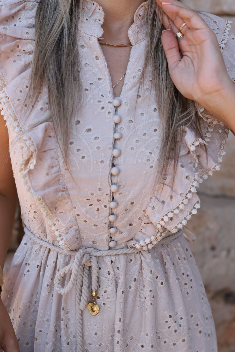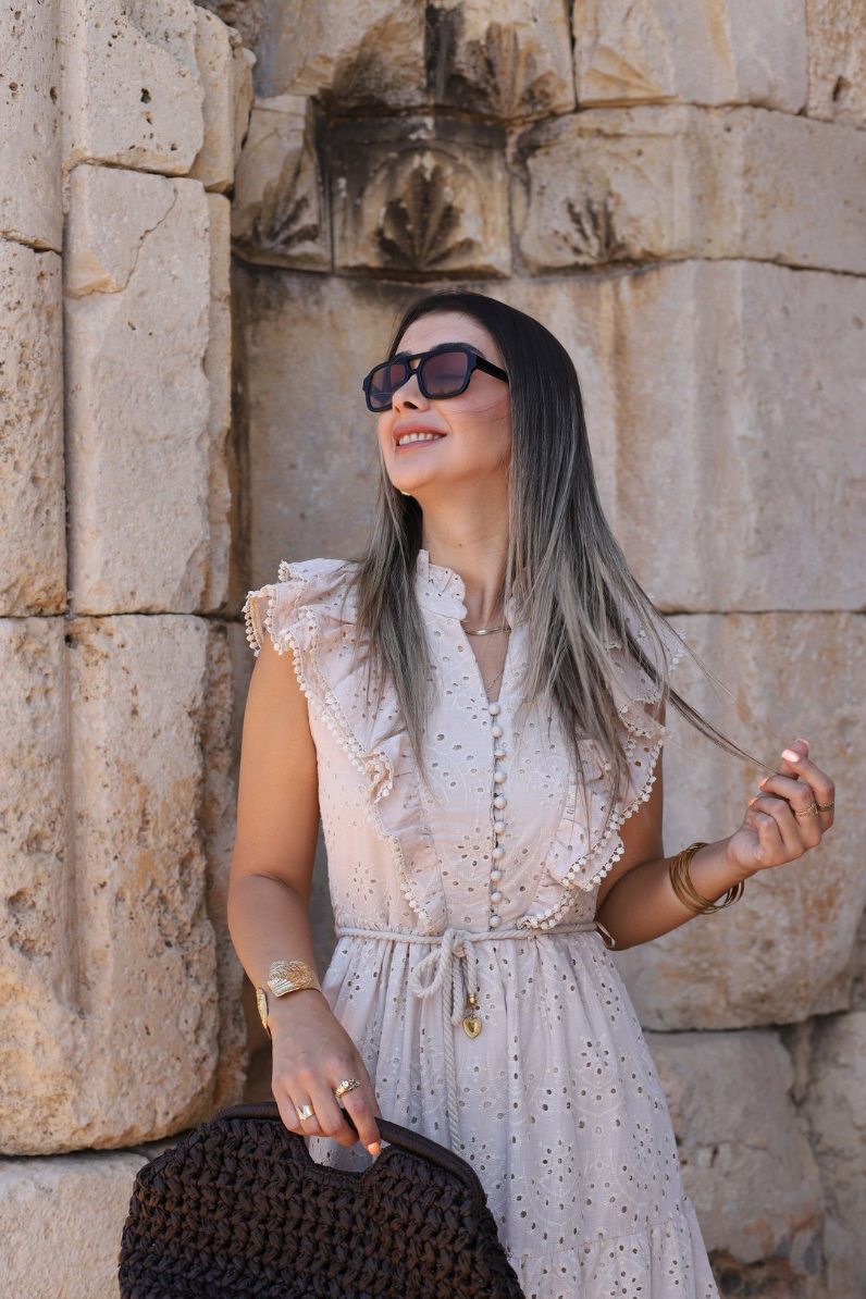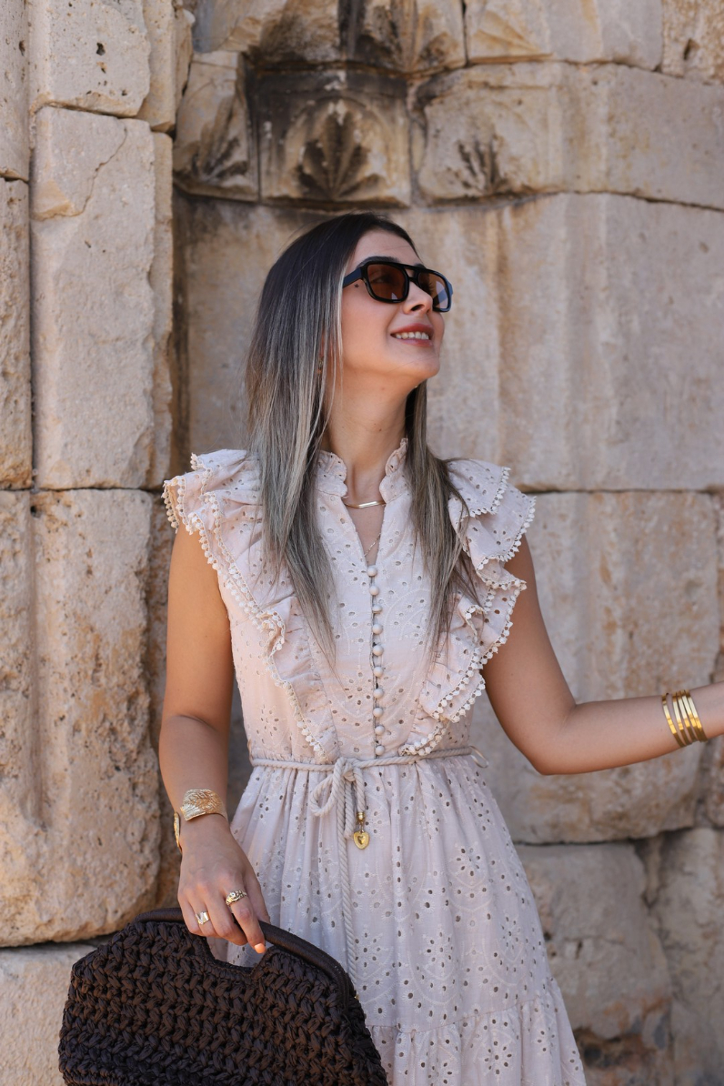 BEJ ÖNÜ FIRFIRLI SIFIR KOL FİSTO ELBİSE