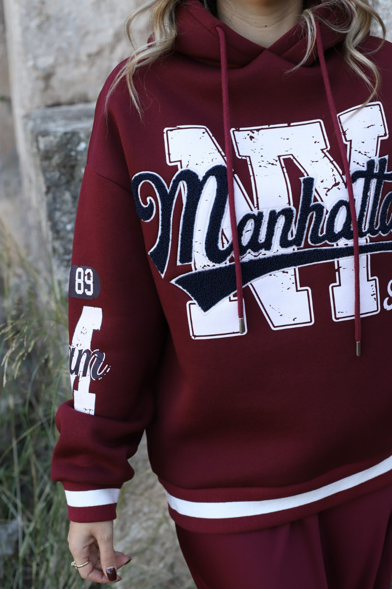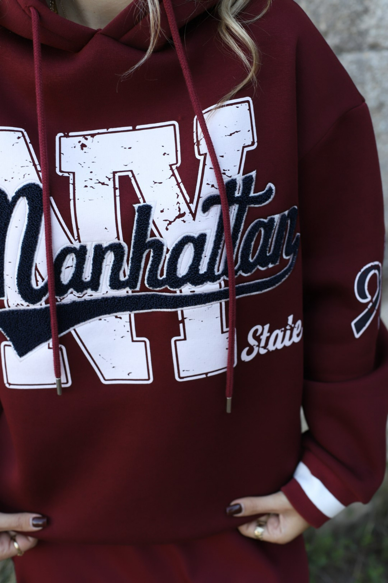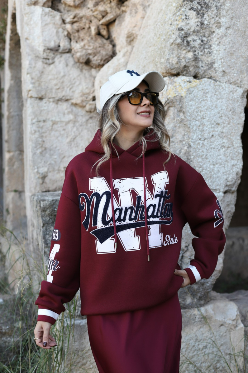 BORDO BASKI DETAYLI KAPÜŞONLU SWEATSHİRT