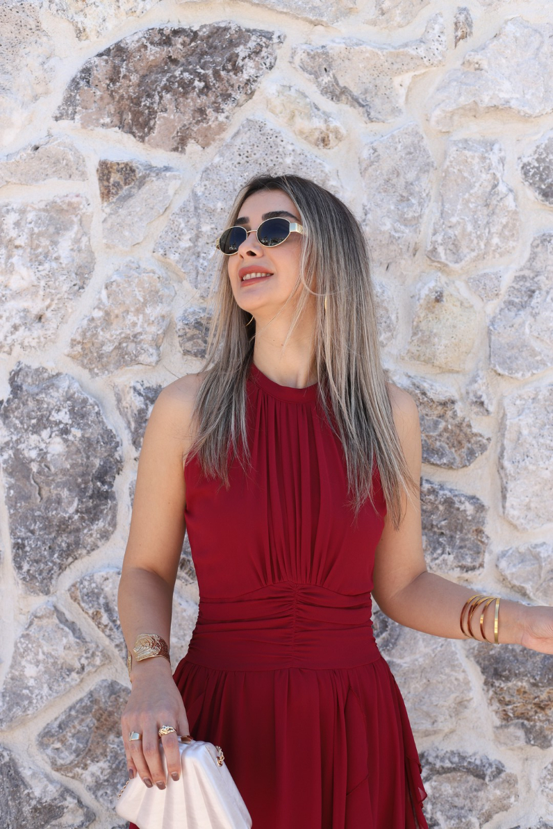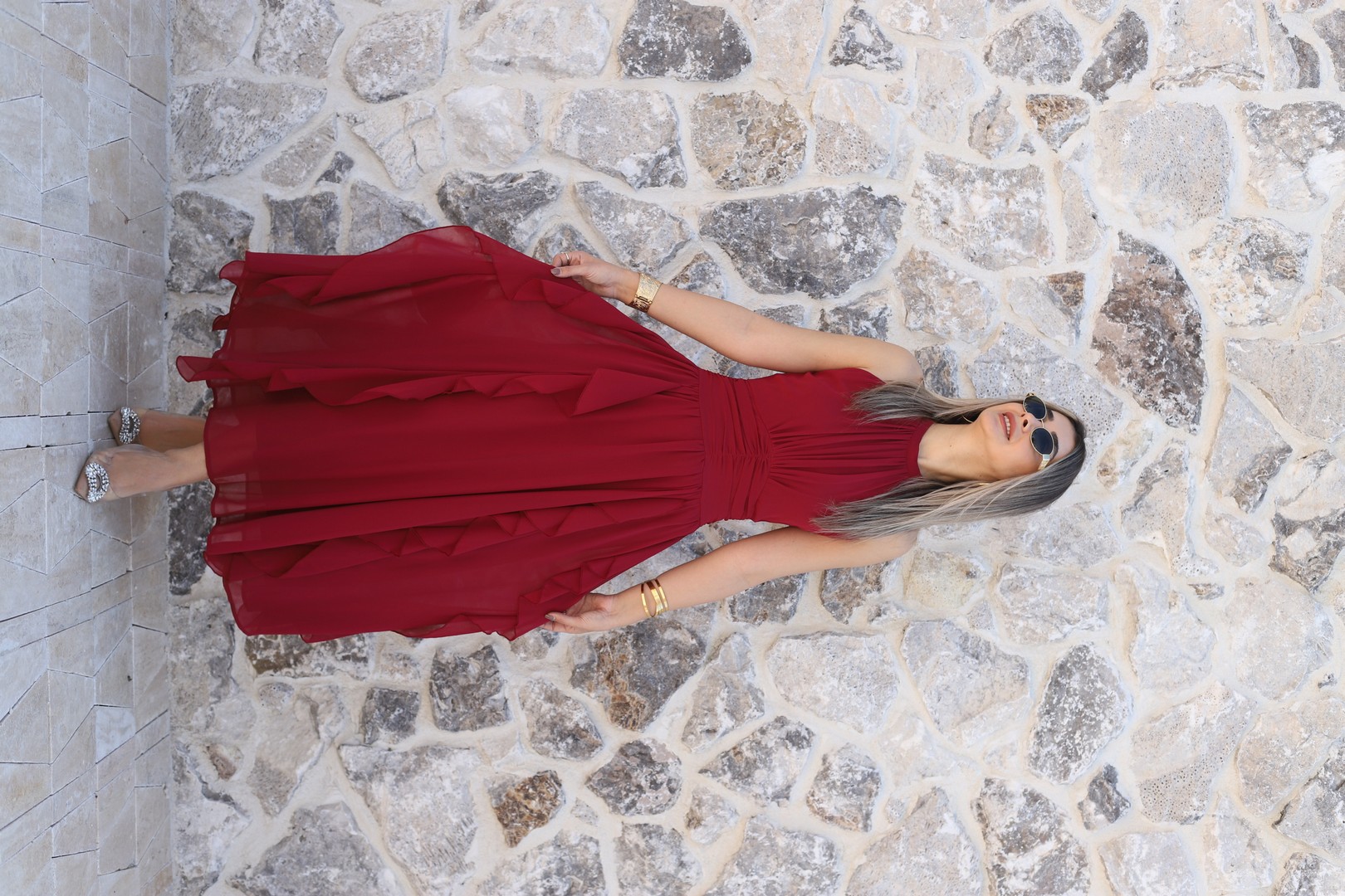 BORDO ÖNÜ BÜZGÜLÜ FIRFIRLI ŞİFON ELBİSE