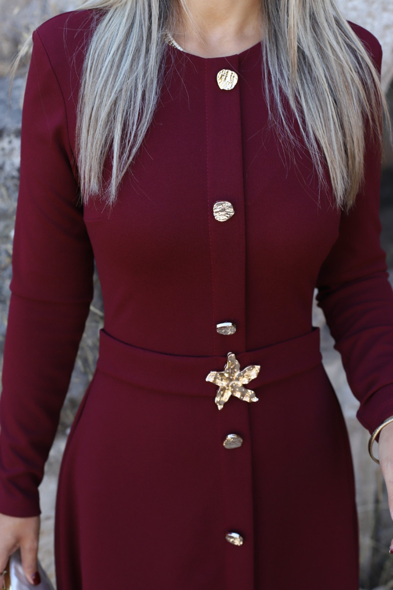 BORDO YILDIZ TOKALI UZUN KOLLU ELBİSE