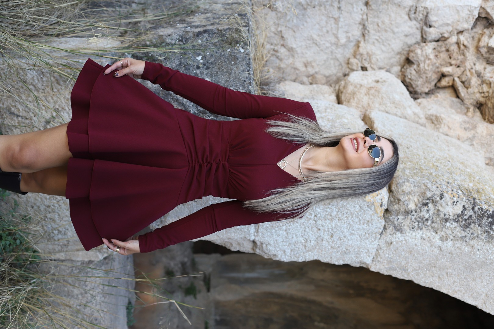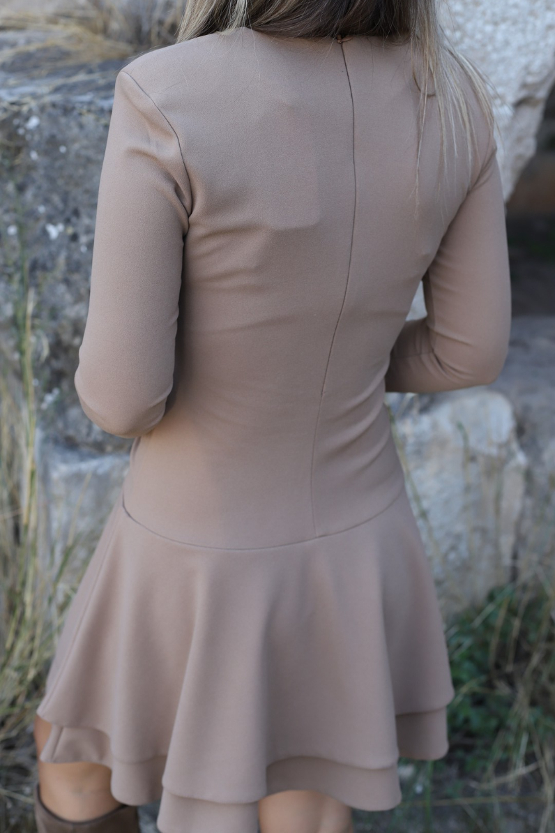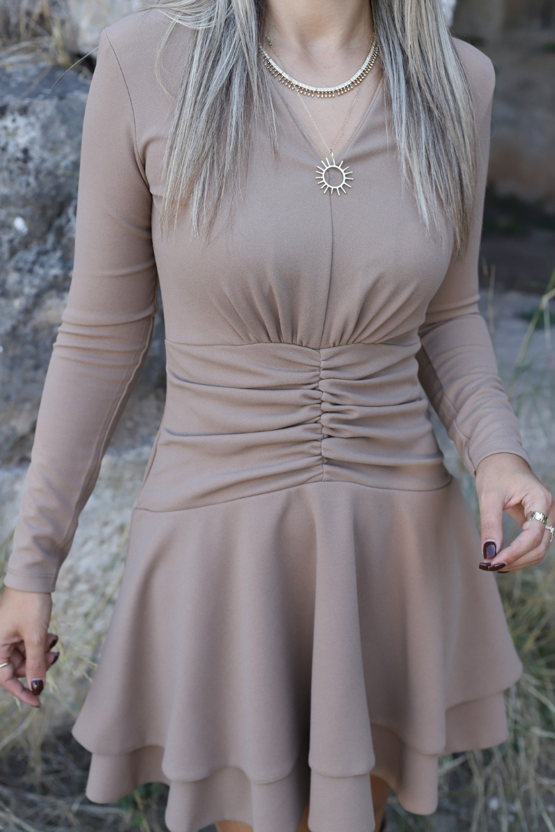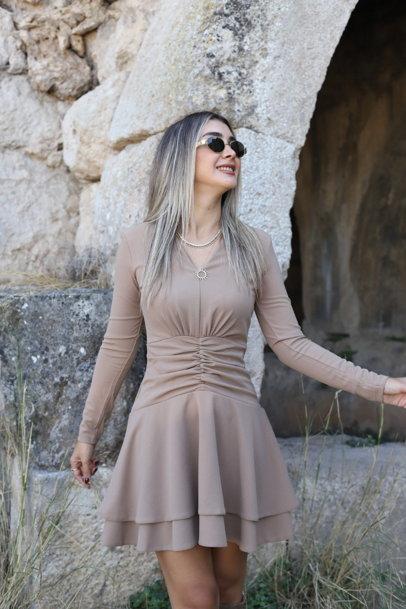 CAMEL V YAKA UZUN KOLLU KLOŞ ELBİSE