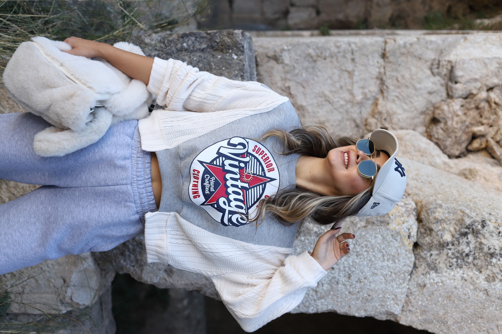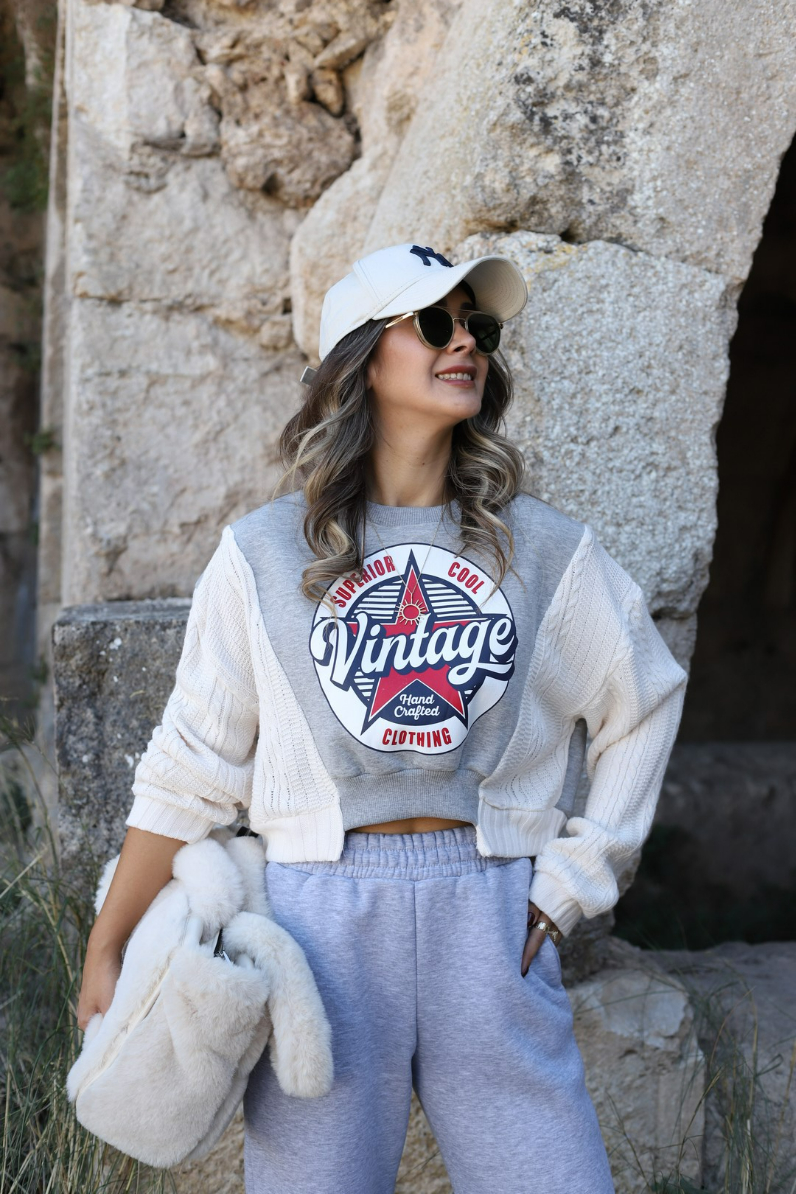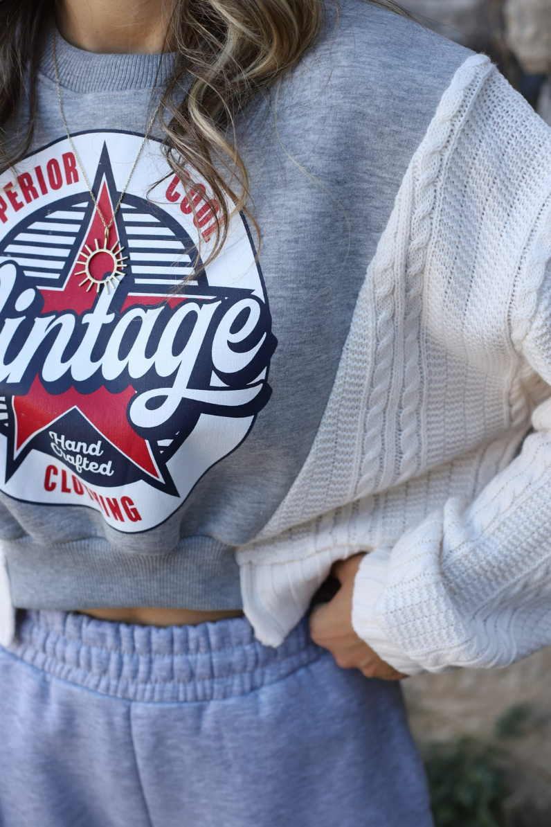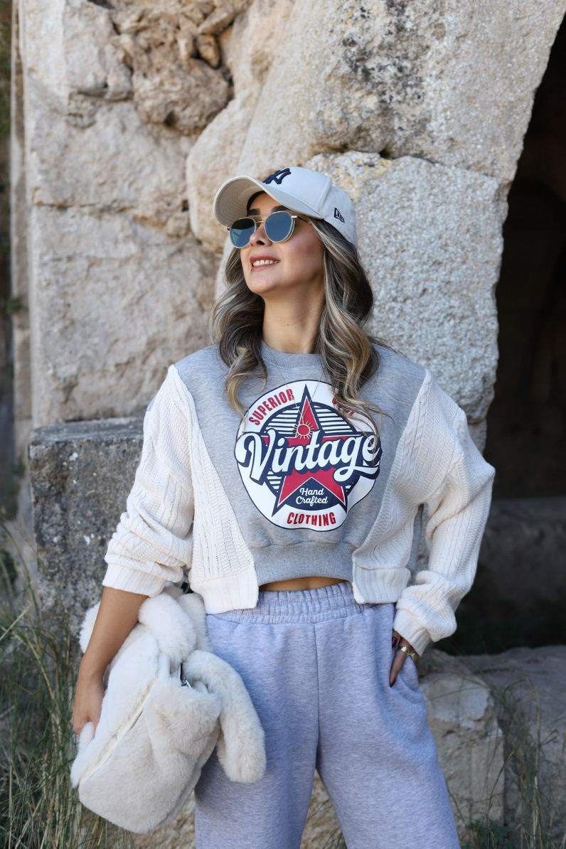 GRİ ÖRGÜ KOLLU BASKILI SWEATSHİRT