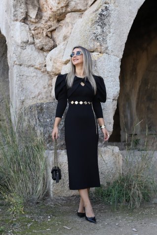KAHVE DEKOLTE DETAY ZİNCİR KEMERLİ ELBİSE