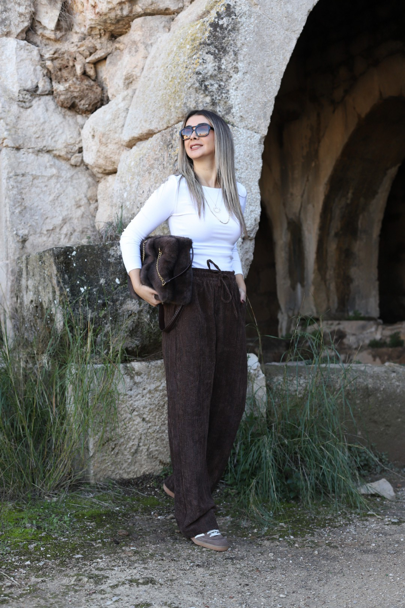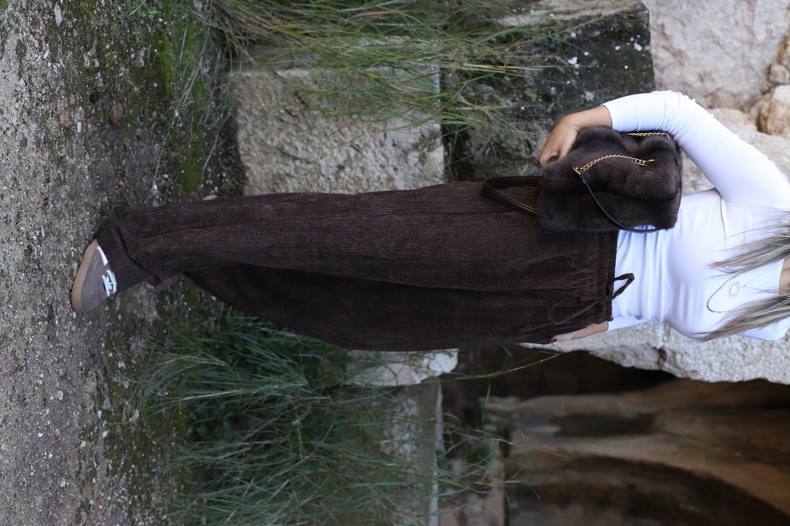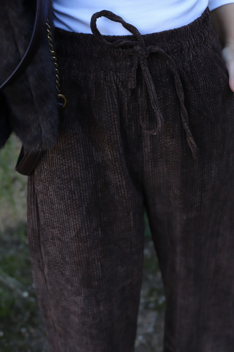 KAHVE KADİFE BELİ LASTİKLİ PANTOLON