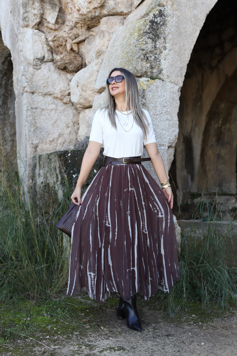 KAHVE KEMER DETAYLI PARÇALI ŞİFON ETEK