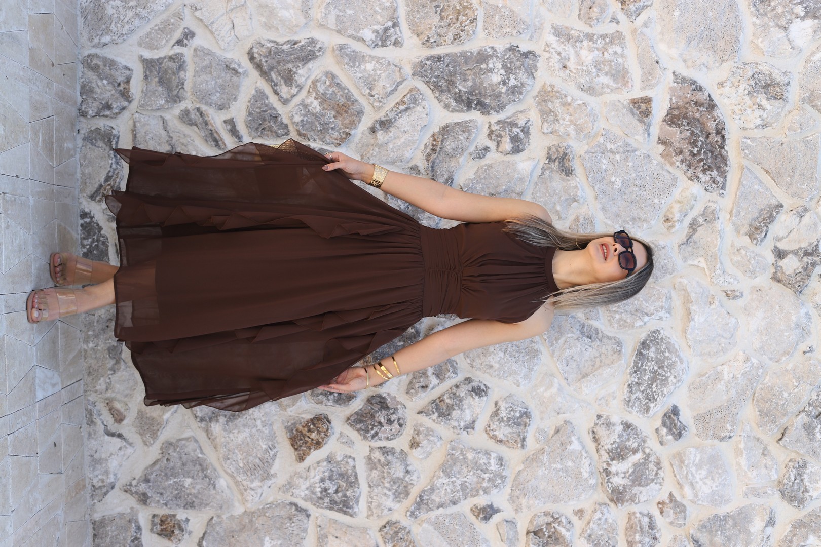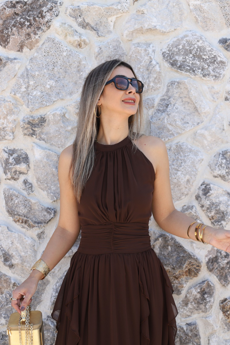 KAHVE ÖNÜ BÜZGÜLÜ FIRFIRLI ŞİFON ELBİSE