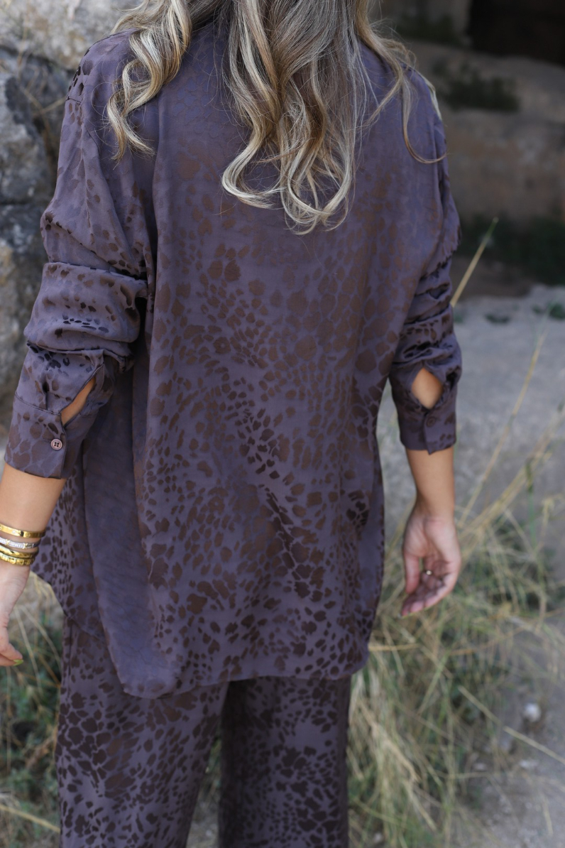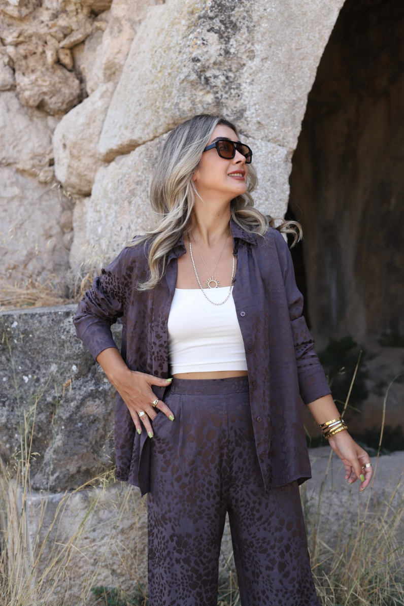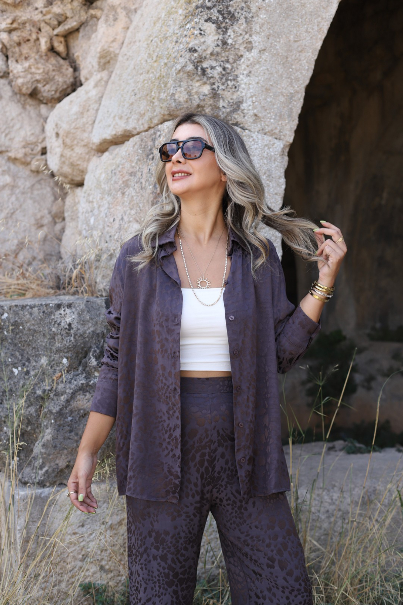 KAHVE SATEN LEOPAR DESEN GÖMLEKLİ PANTOLON TAKIM