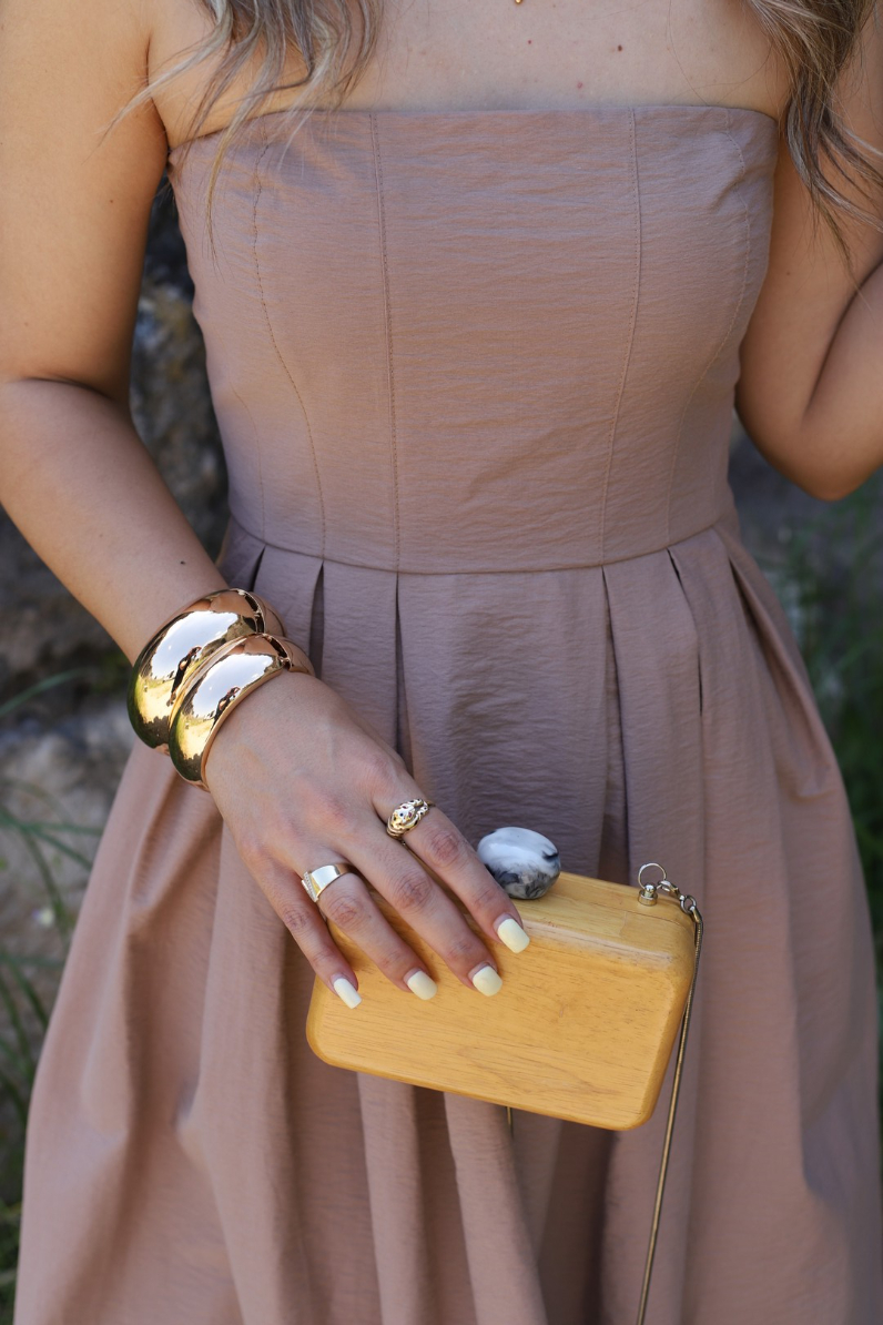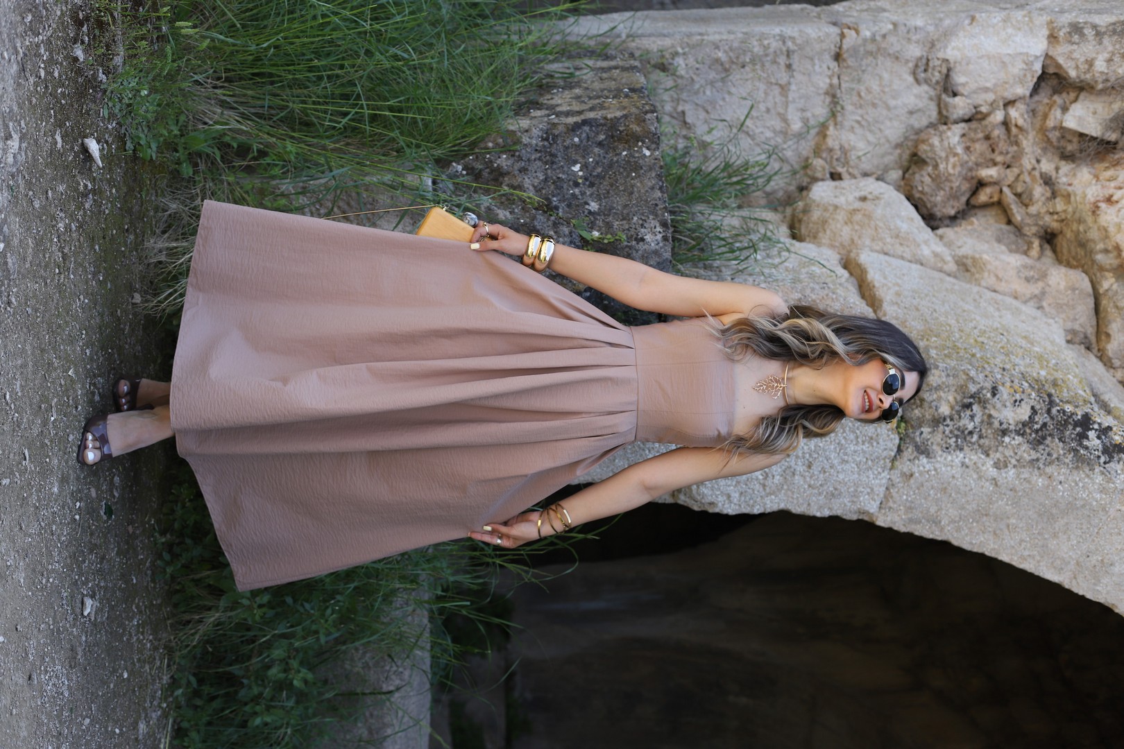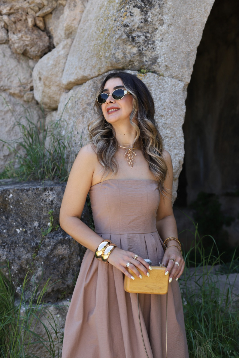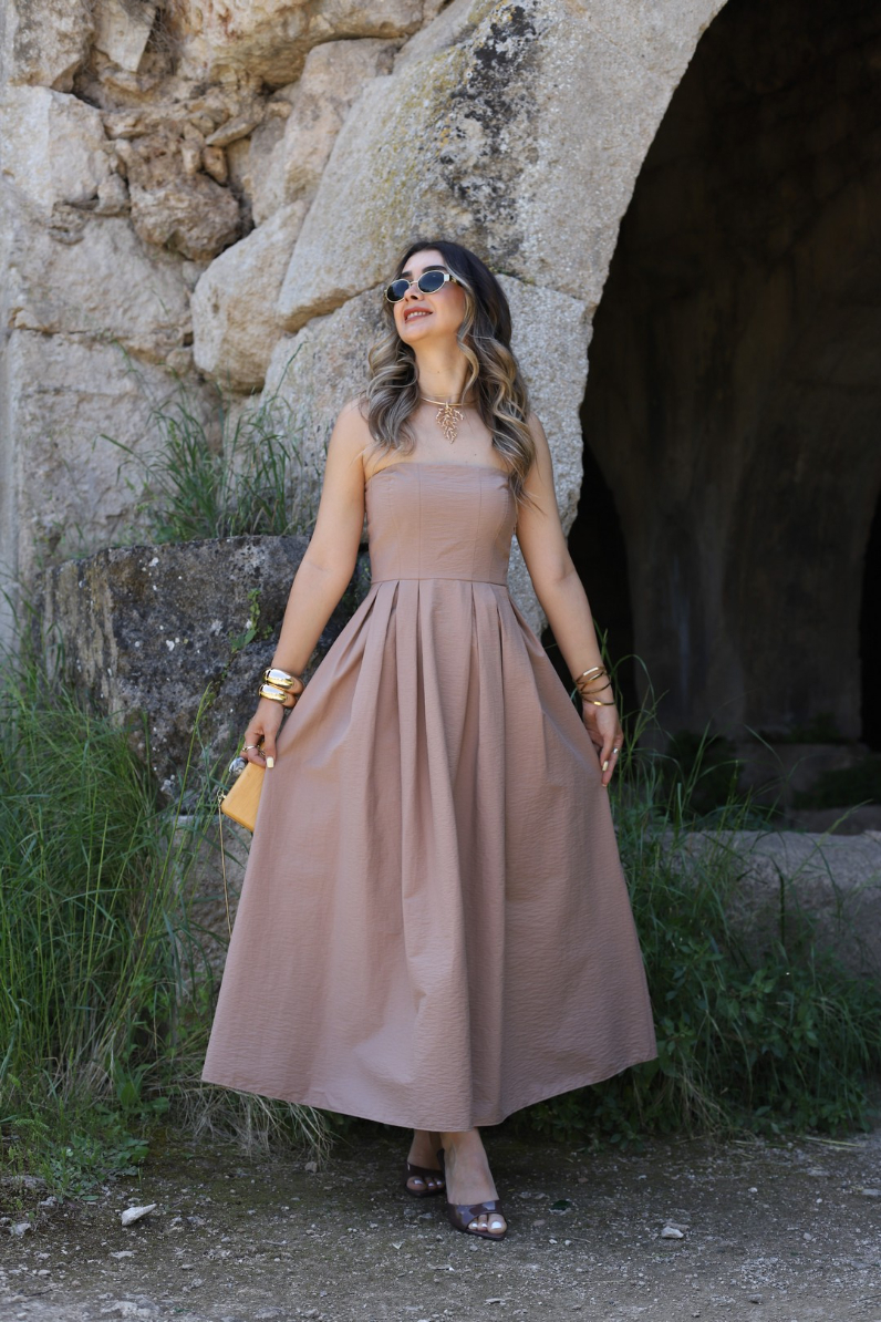 KAHVE STRAPLEZ PİLELİ ELBİSE