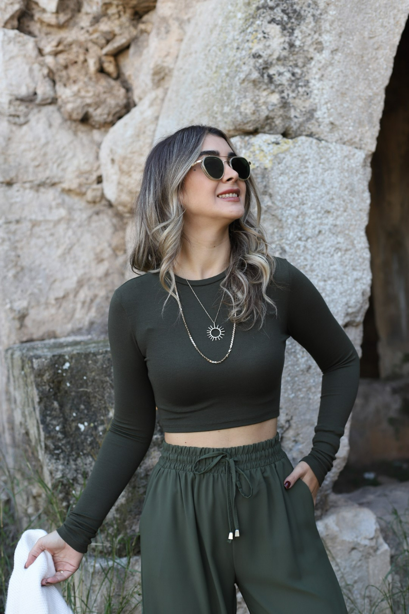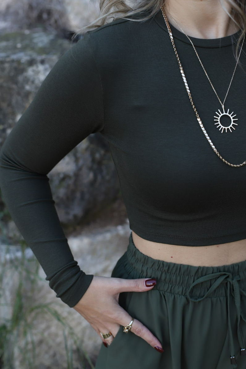 KOYU HAKİ UZUN KOLLU CROP TOP
