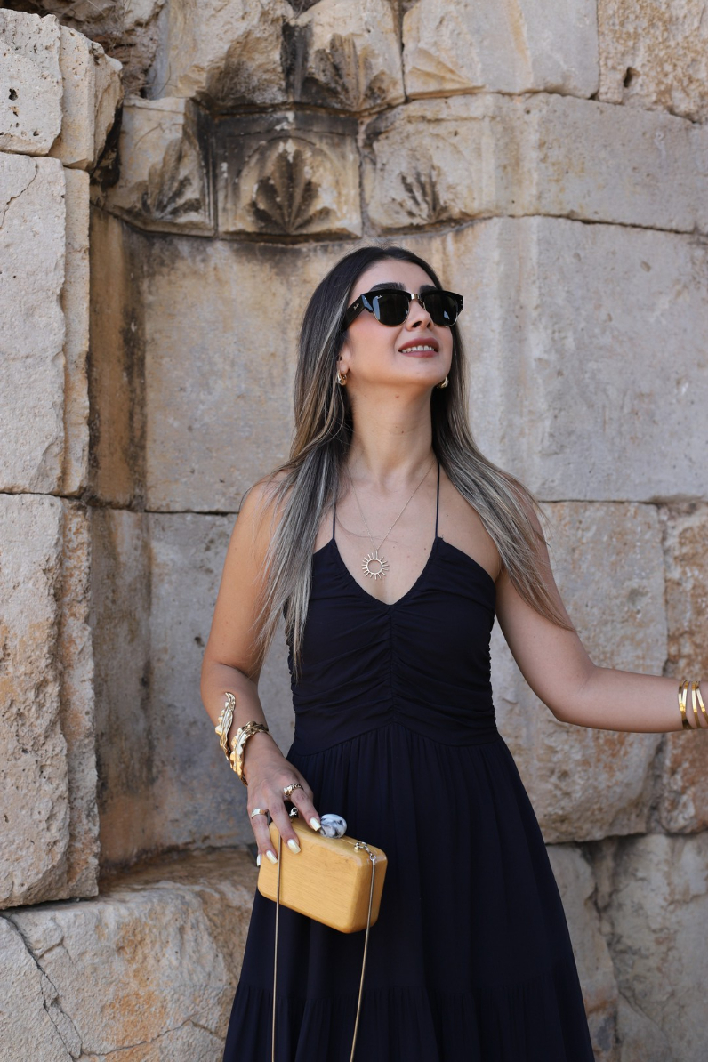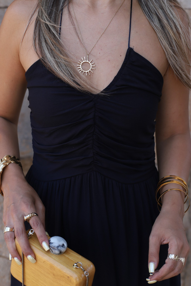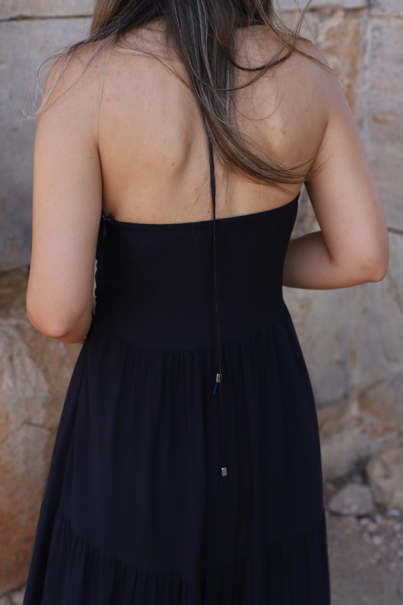 LACİVERT BÜZGÜ DETAY BOYUN BAĞLAMALI SALAŞ ELBİSE
