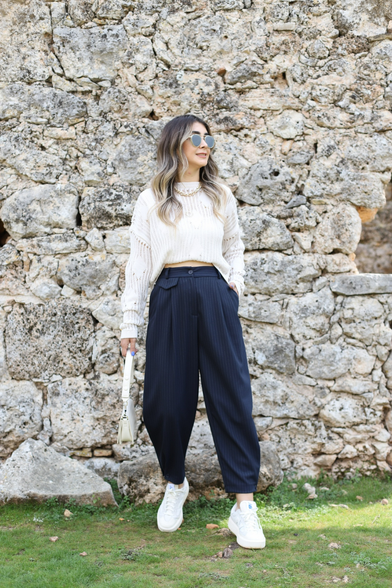 LACİVERT ÇİZGİLİ BEL DETAY PANTOLON