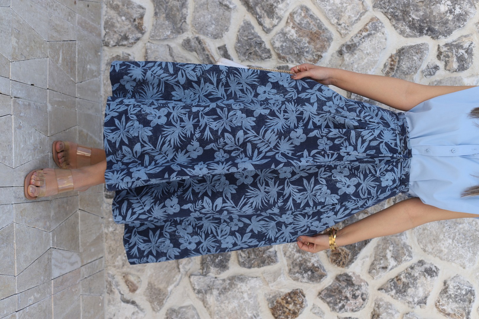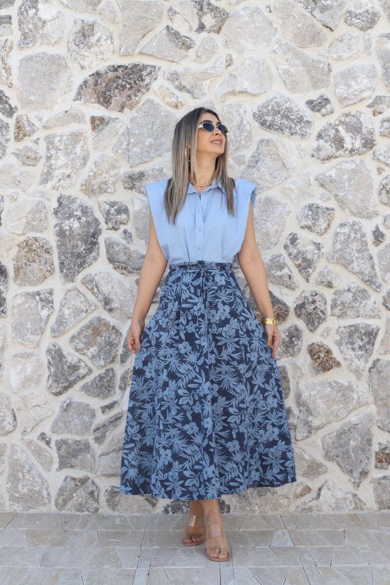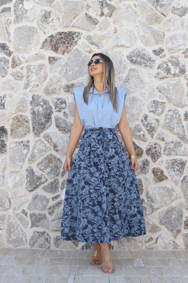 MAVİ DESENLİ CEPLİ GABARDİN KLOŞ ETEK
