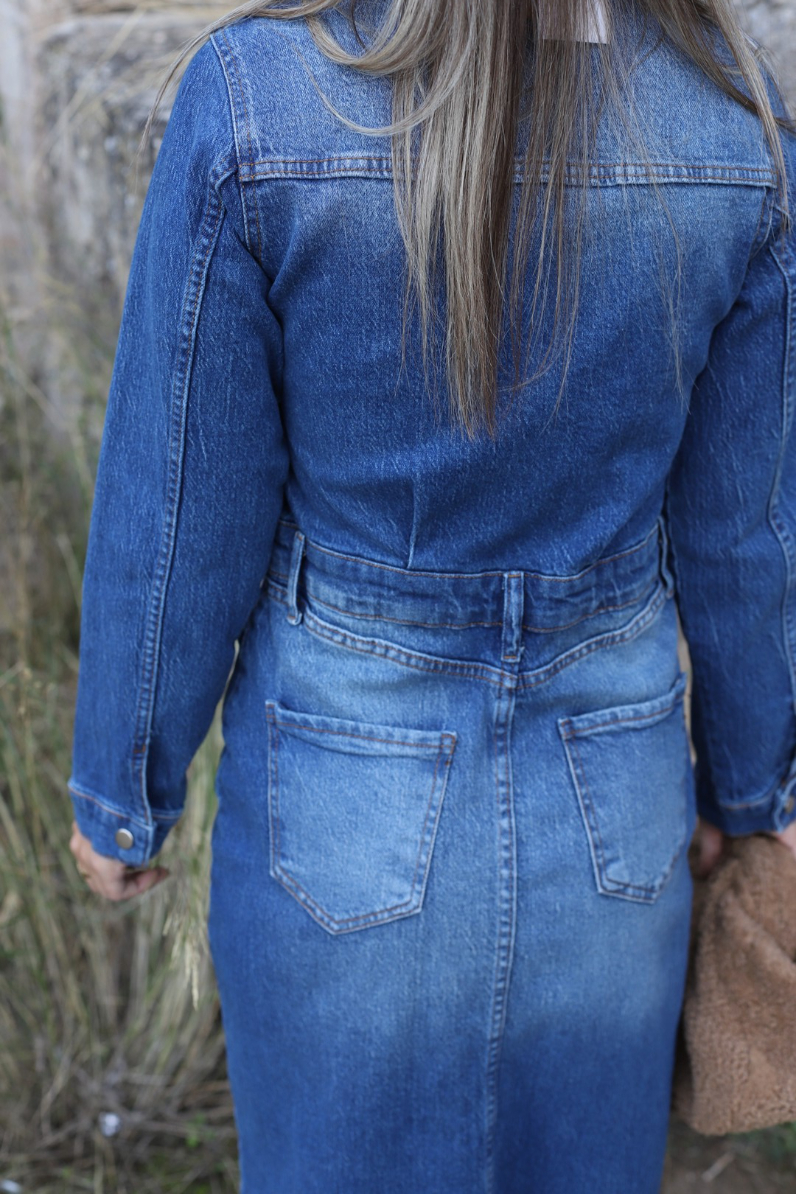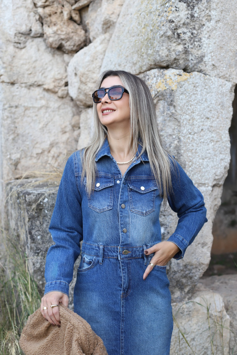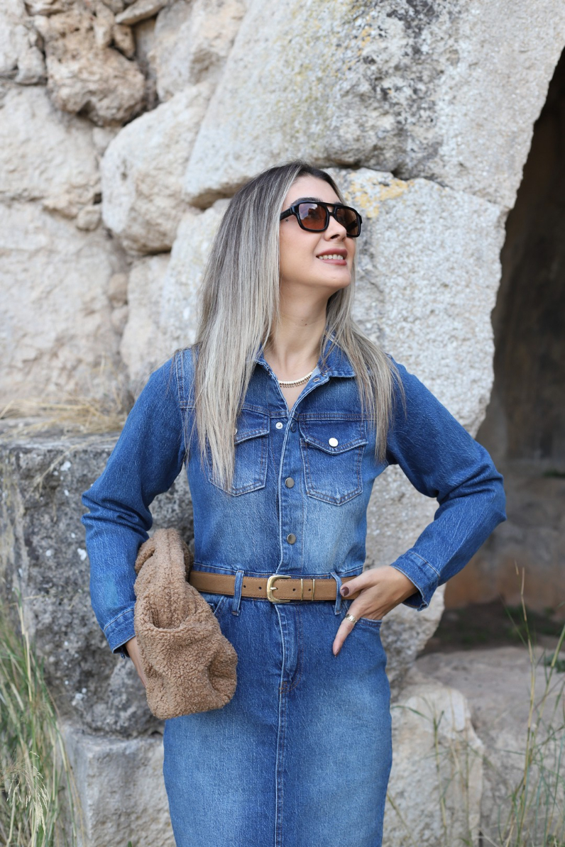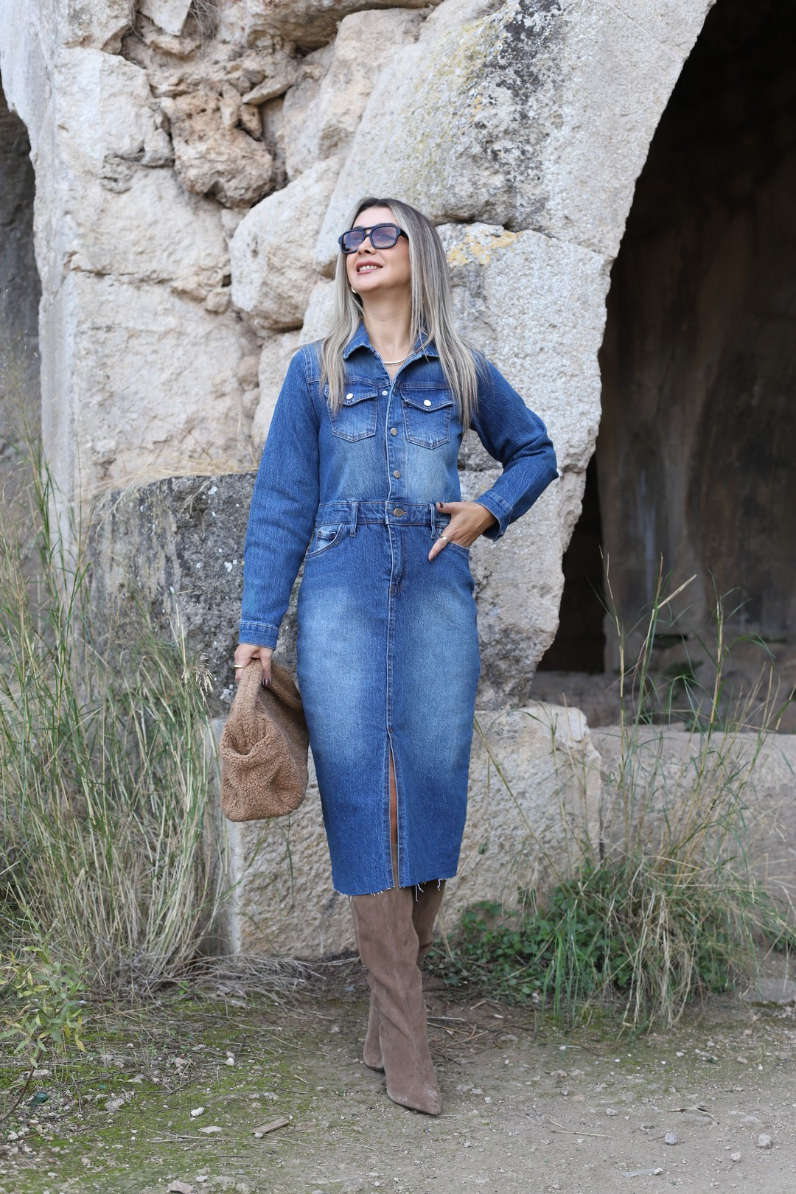 MAVİ MİDİ BOY UZUN KOL PREMİUM JEAN ELBİSE