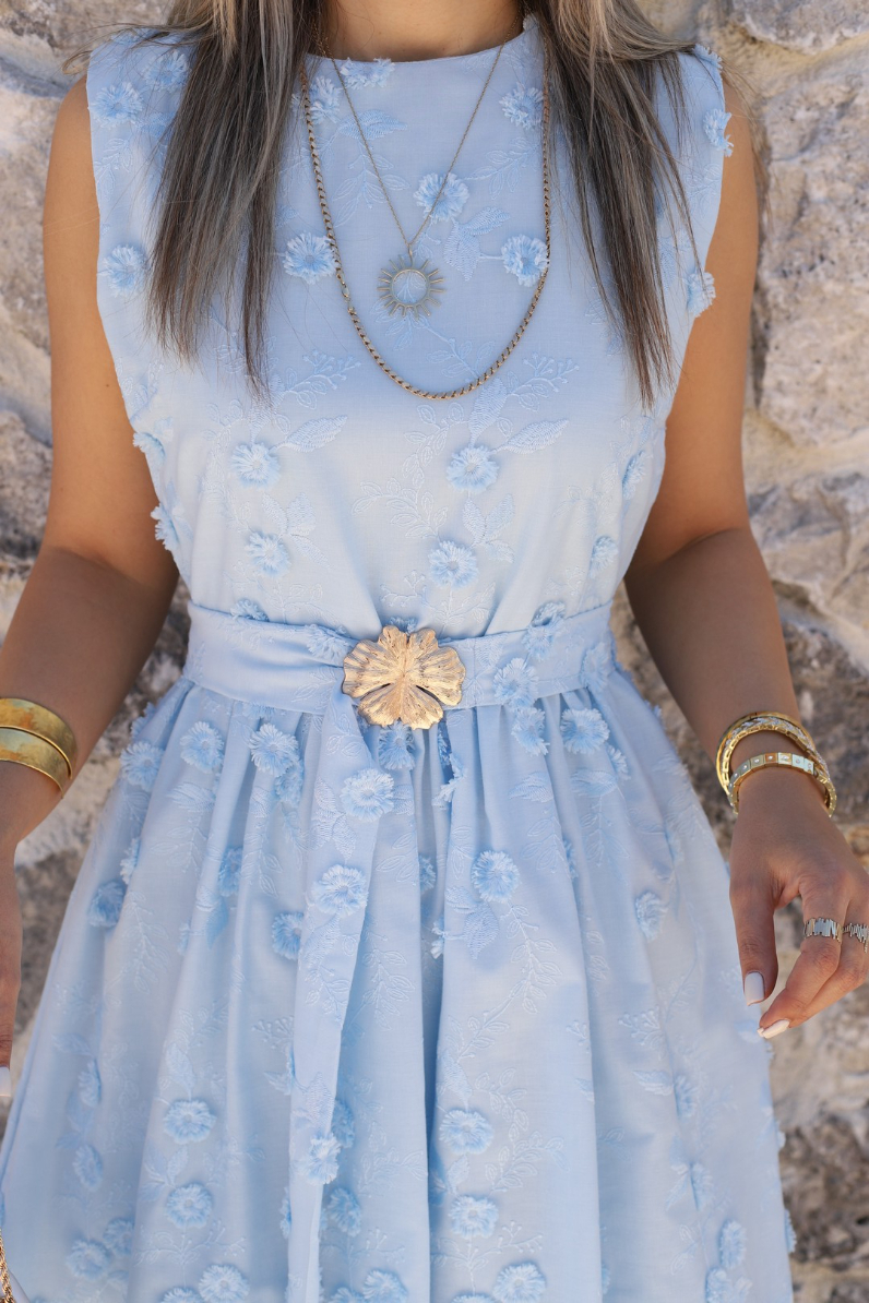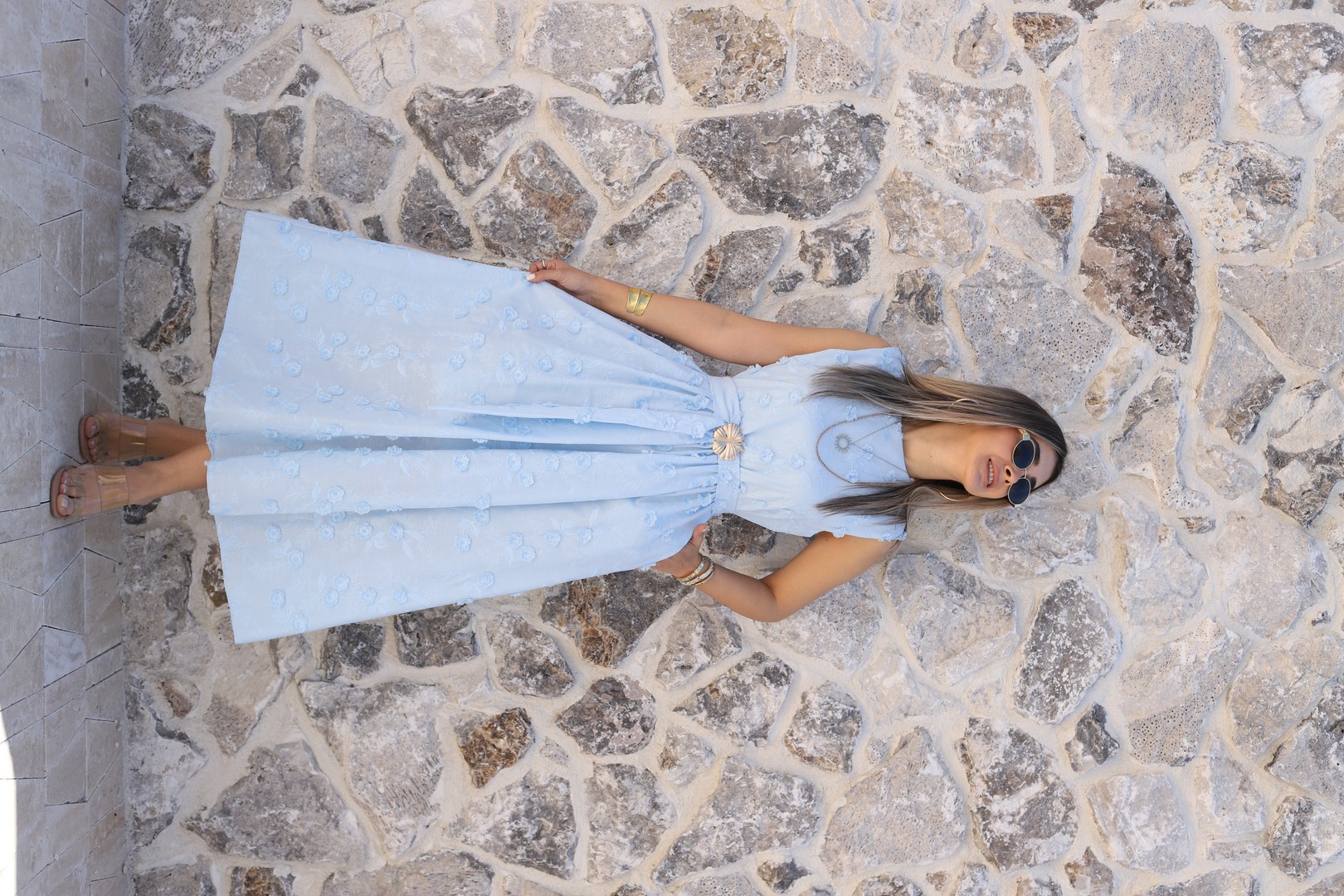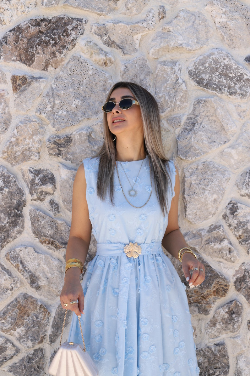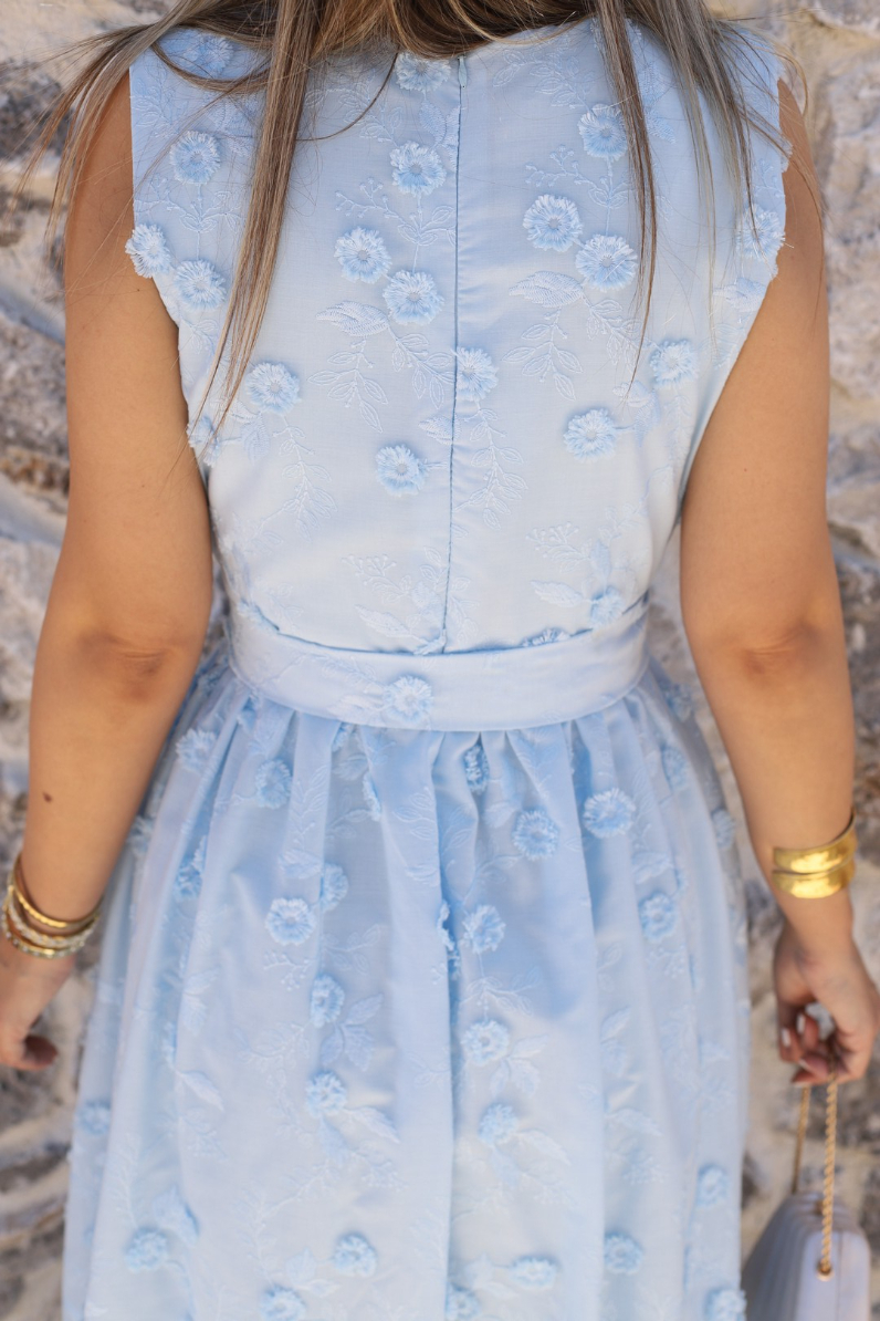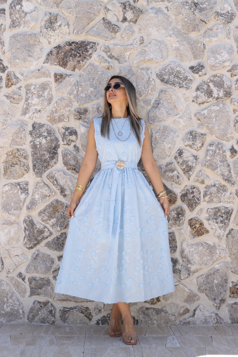 MAVİ ÜÇ BOYUTLU ÇİÇEKLİ ELBİSE