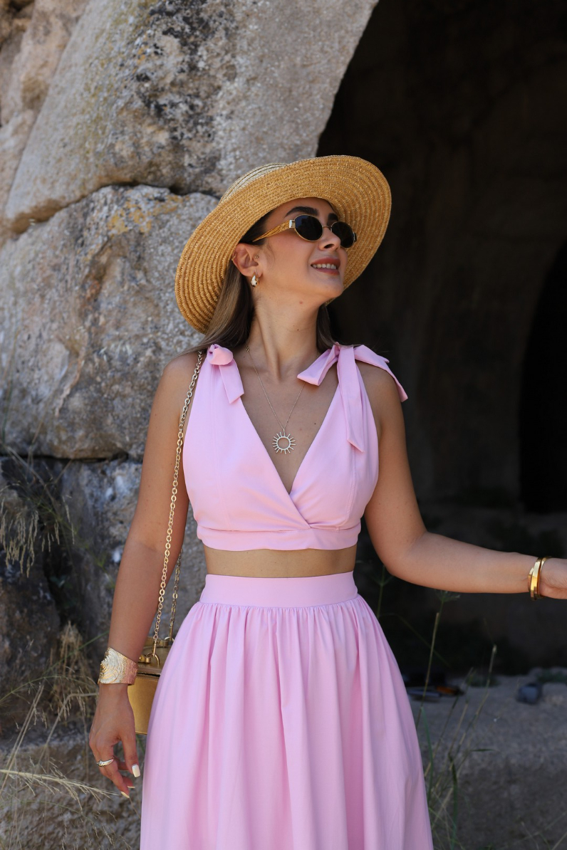 PEMBE BAĞLAMA DETAYLI BÜSTİYERLİ ETEK TAKIM