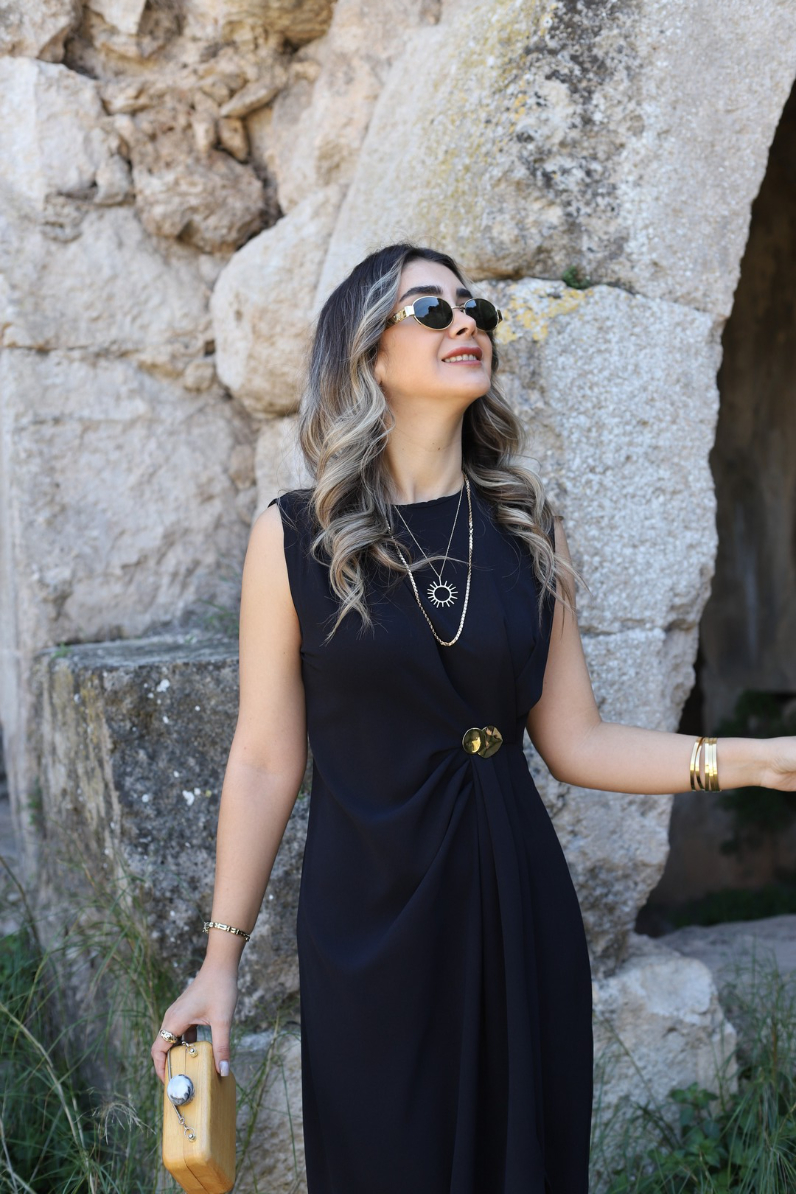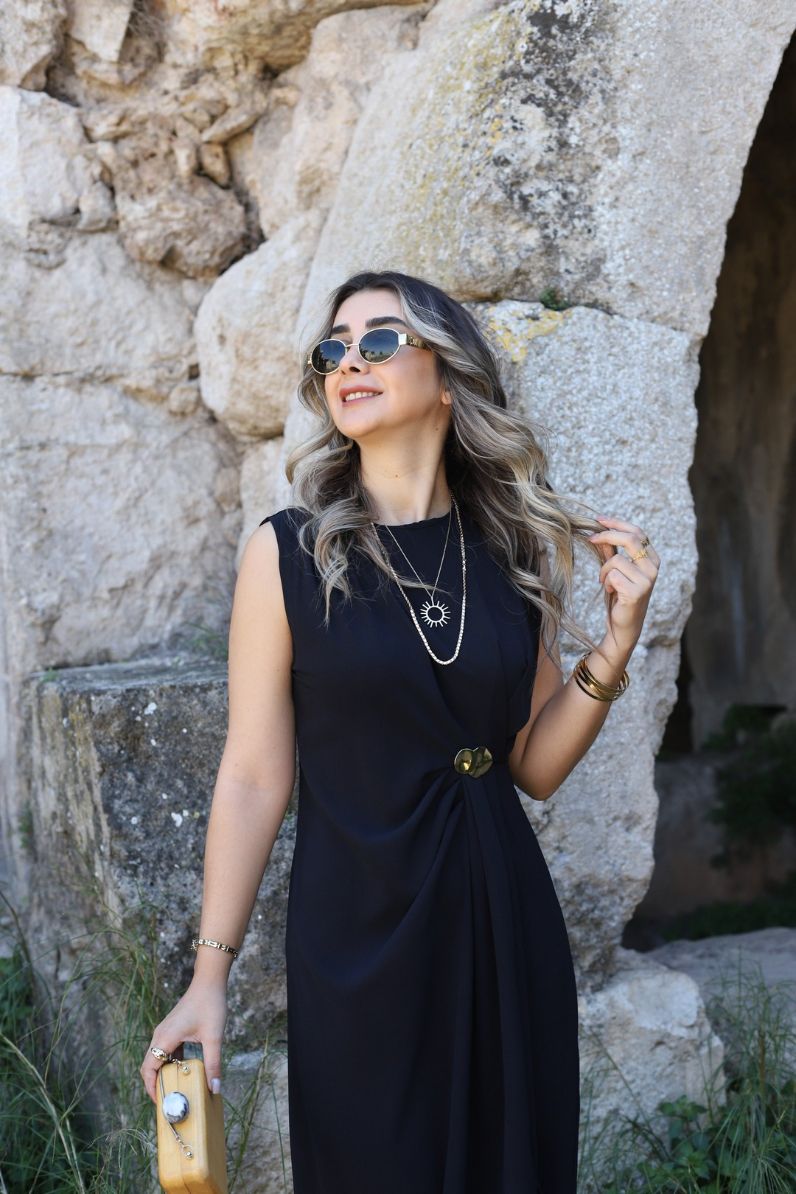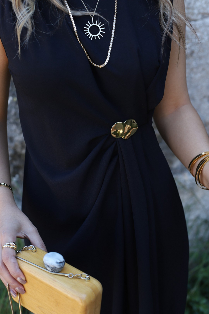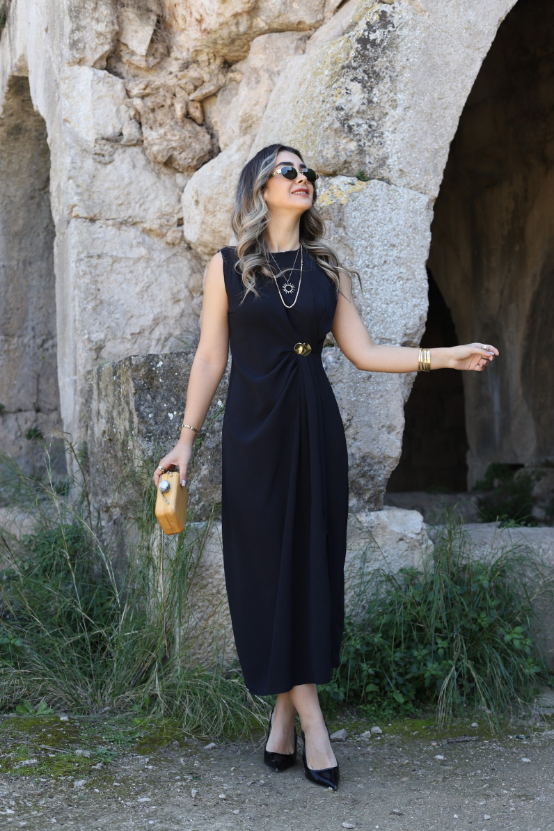 SİYAH ORJİN SIFIR KOL DRAPELİ TOKALI ELBİSE