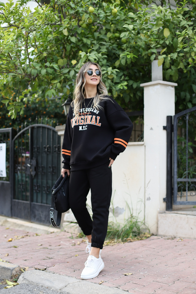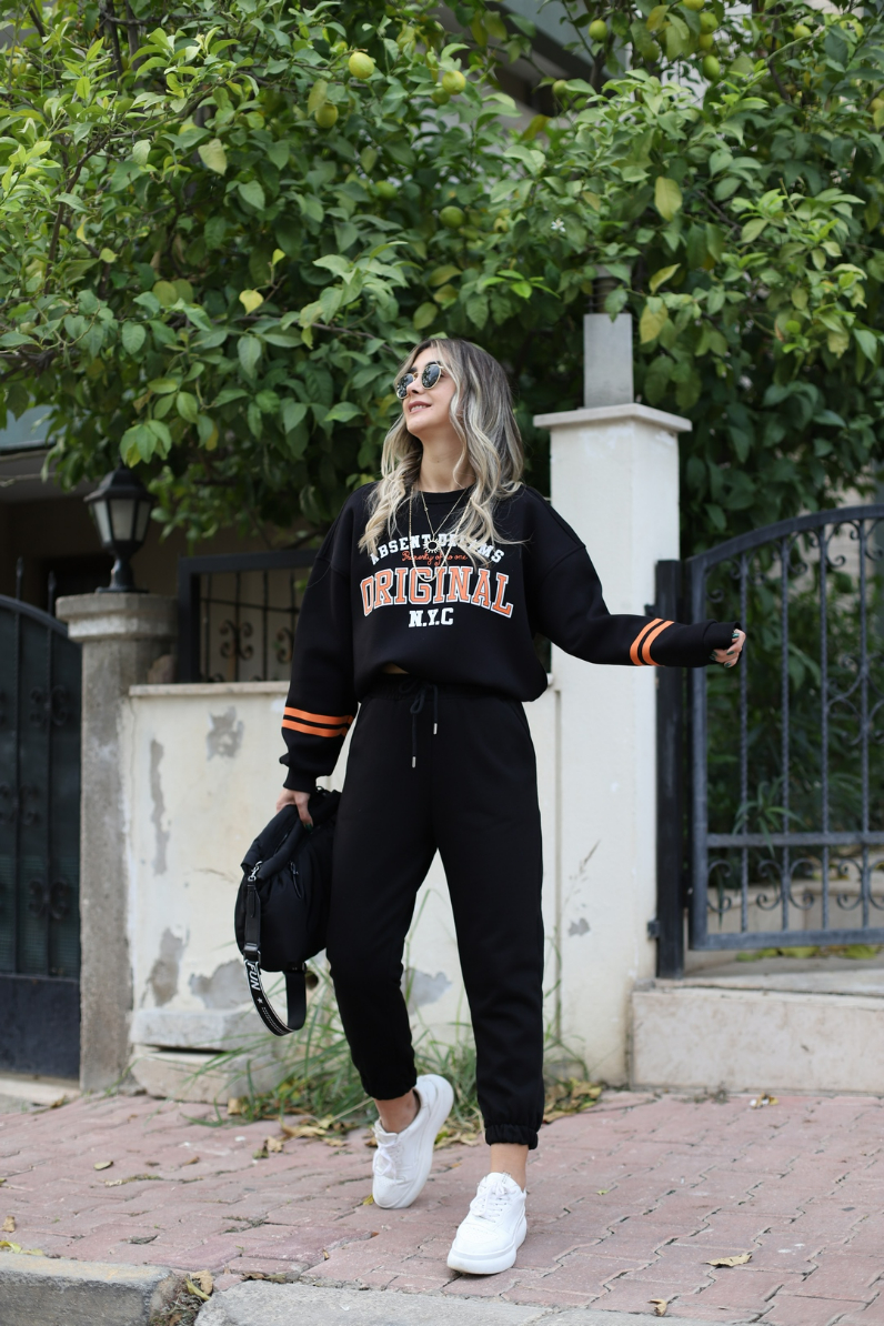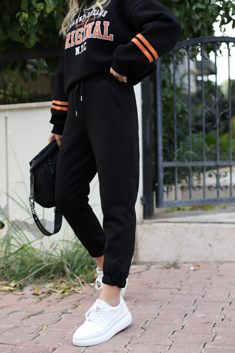 SİYAH PAÇASI LASTİKLİ ŞARDONLU ÜÇ İPLİK EŞOFMAN