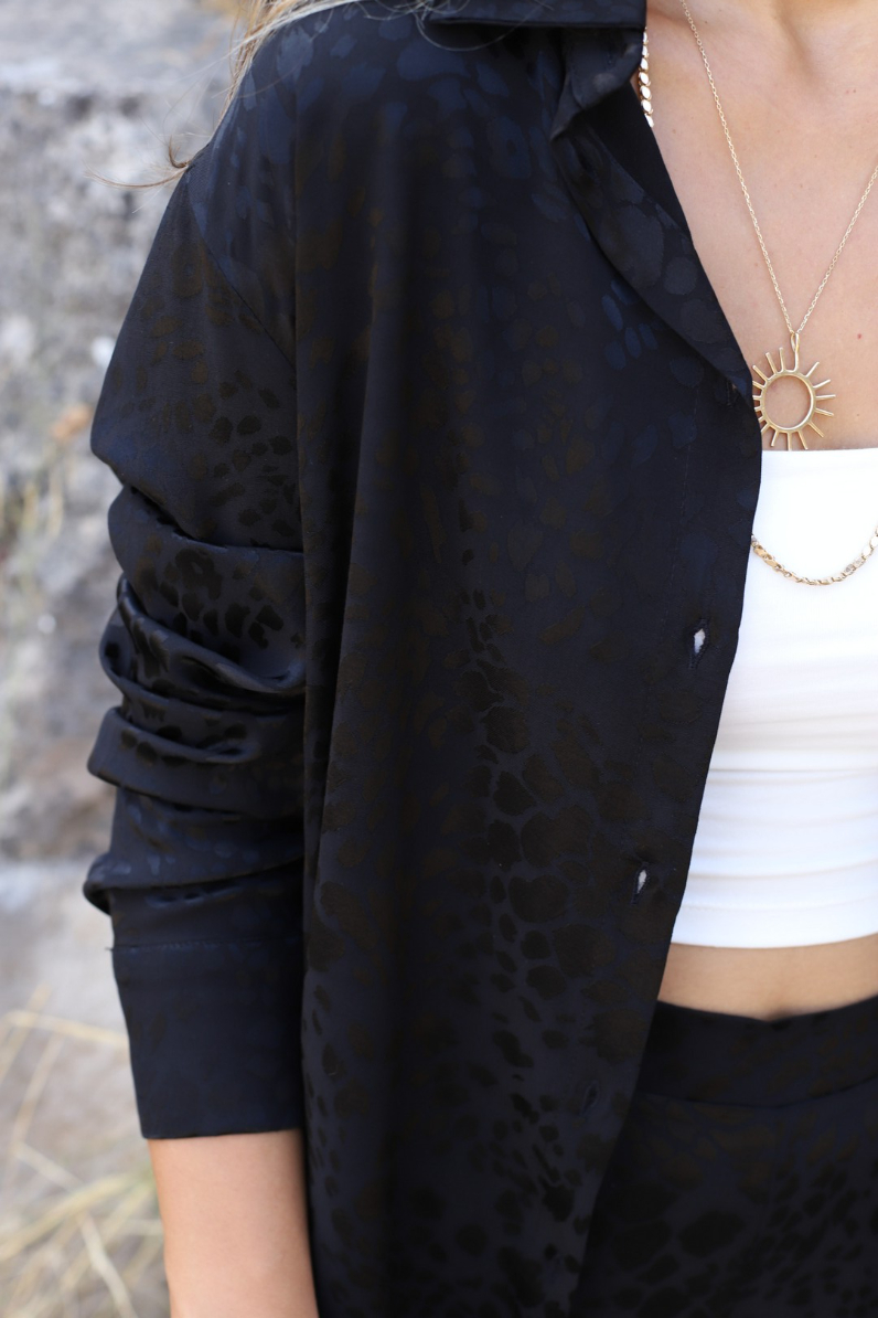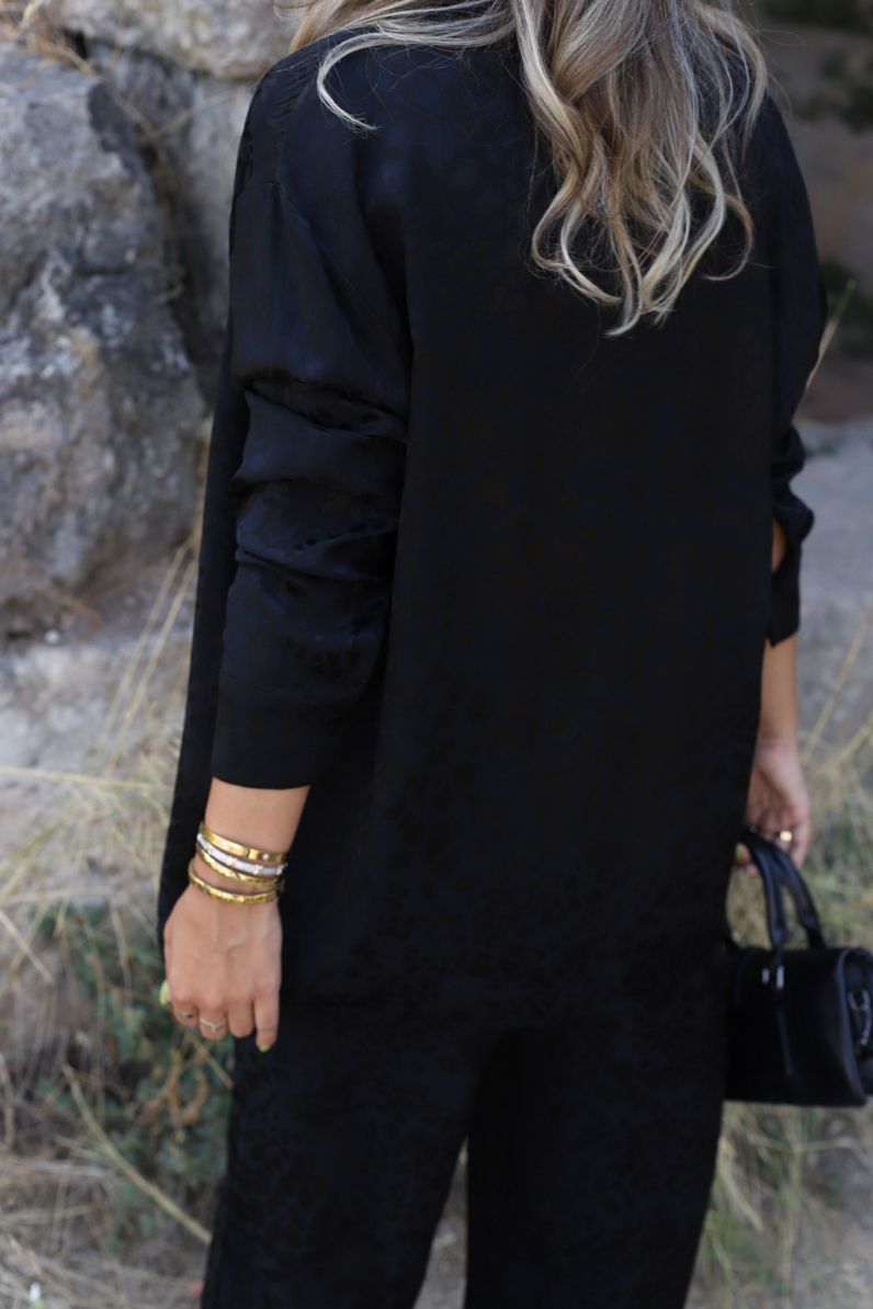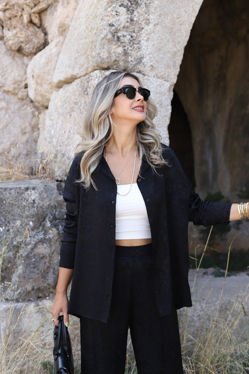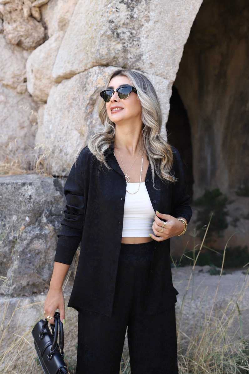 SİYAH SATEN LEOPAR DESEN GÖMLEKLİ PANTOLON TAKIM