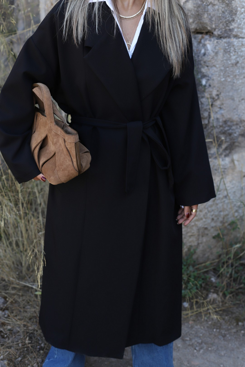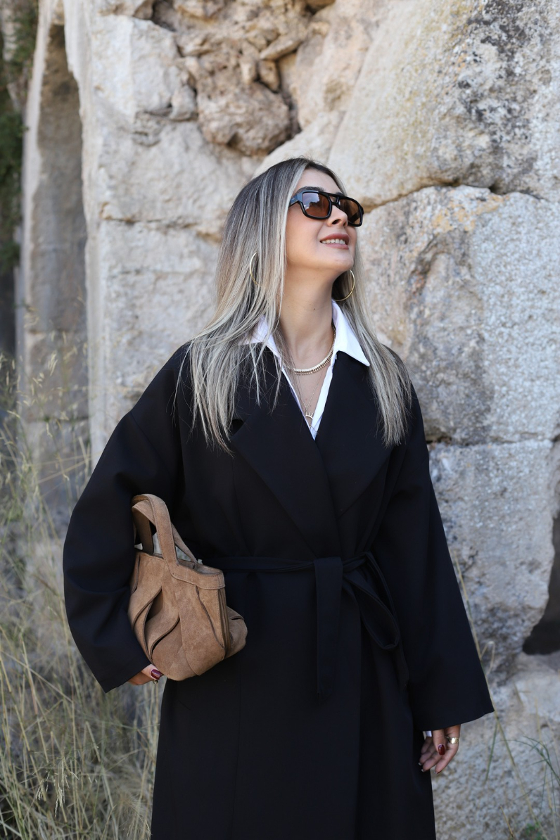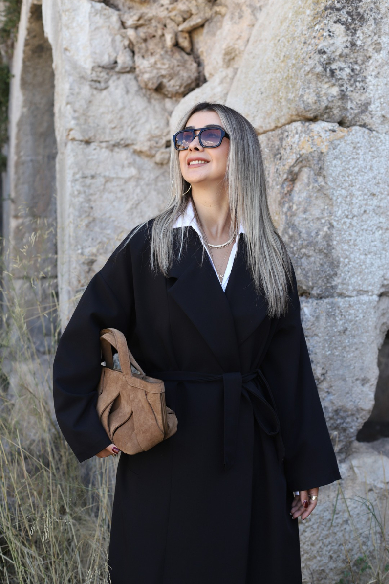 SİYAH STANDART BEDEN ASTARLI KUŞAK DETAY TRENÇKOT