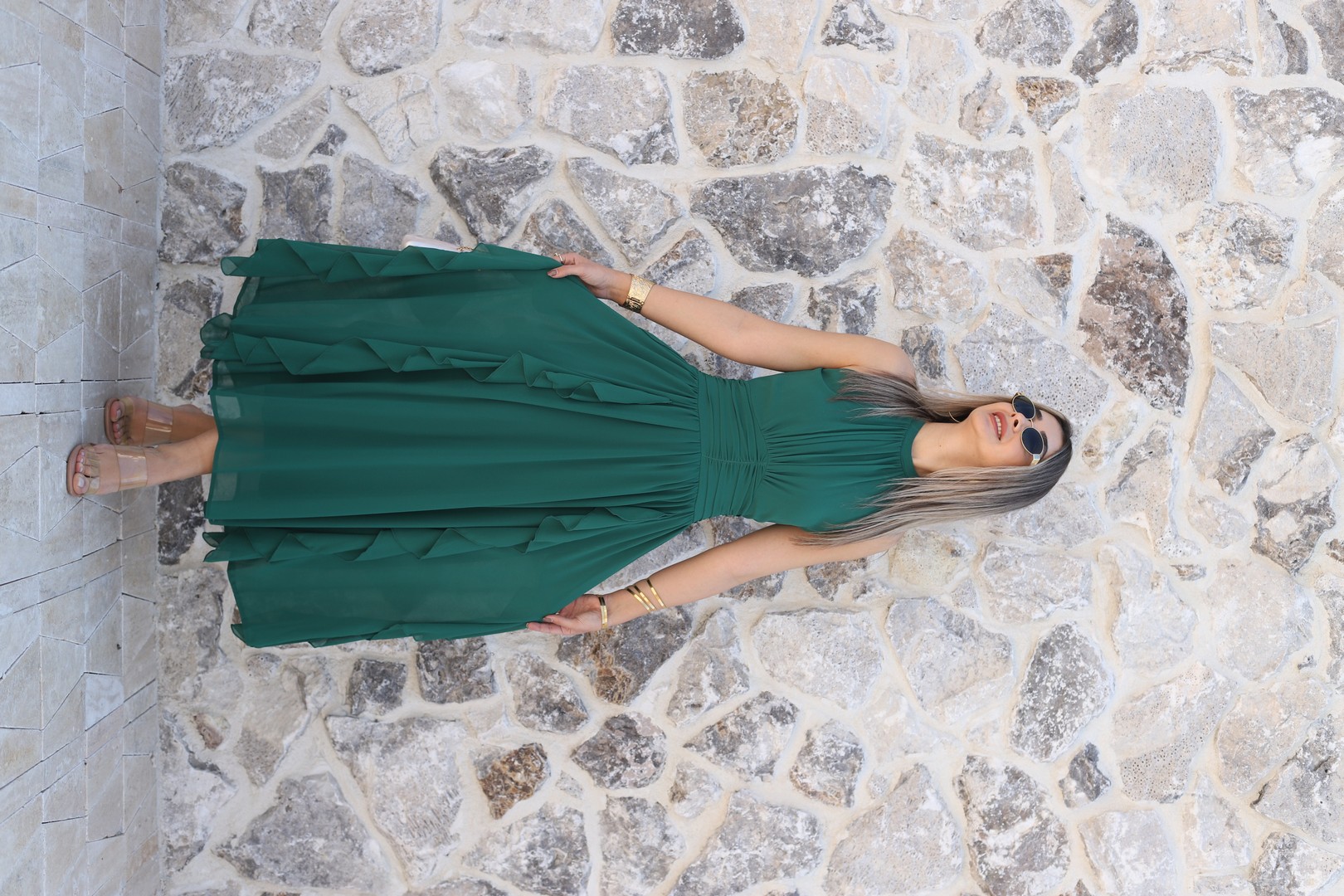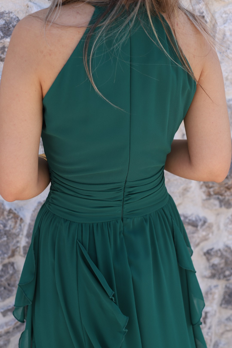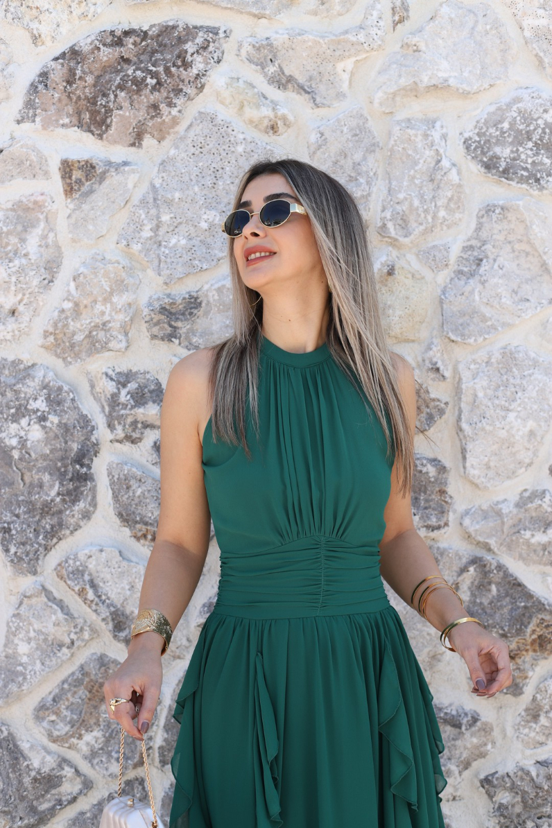 ZÜMRÜT YEŞİLİ ÖNÜ BÜZGÜLÜ FIRFIRLI ŞİFON ELBİSE